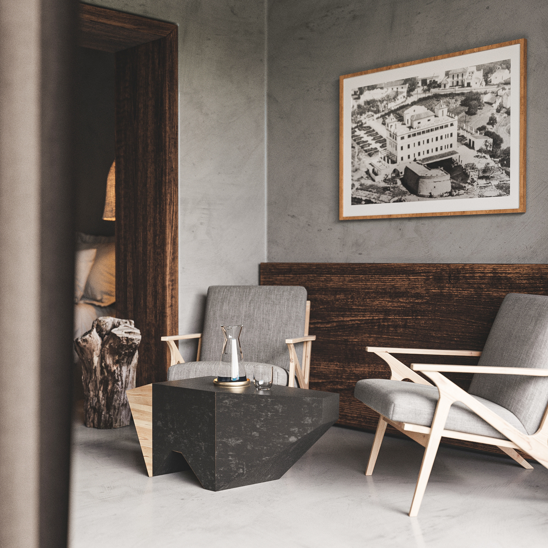 Con un interiorismo rústico, un diseño 3D realista hace que el conjunto de las infografías nos de sensación de relajación y armonía junto con una cálida iluminación. Una arquitectura con un gran espacio y detalles únicos.