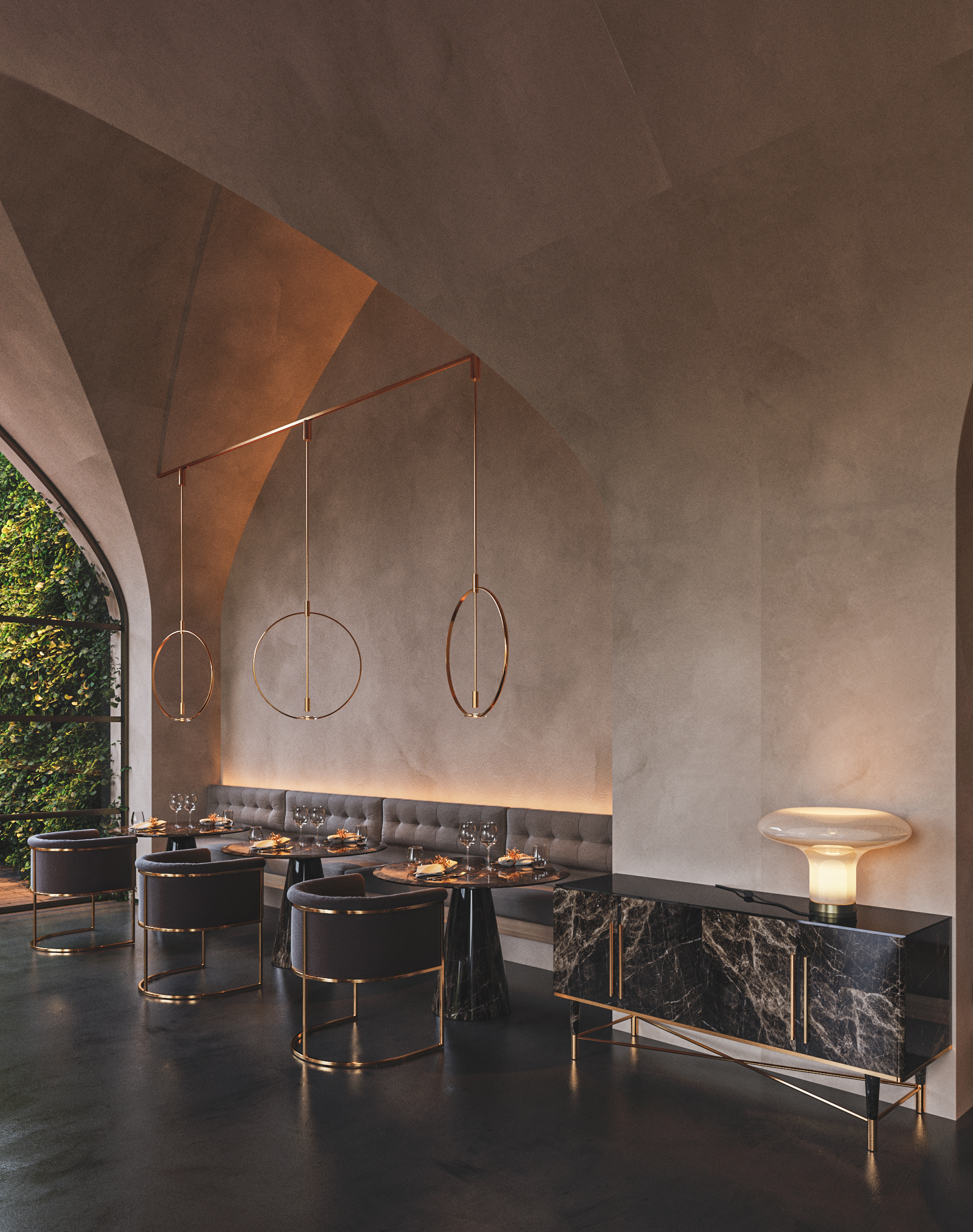 Un salón principal caracterizado por una arquitectura moderna con arcos apuntados, colores cálidos. En cuanto a decoración, cuenta con la prestigiosa marca de sillones comedor de Kettal, diseñador y fabricante de muebles para uso doméstico y comercial.