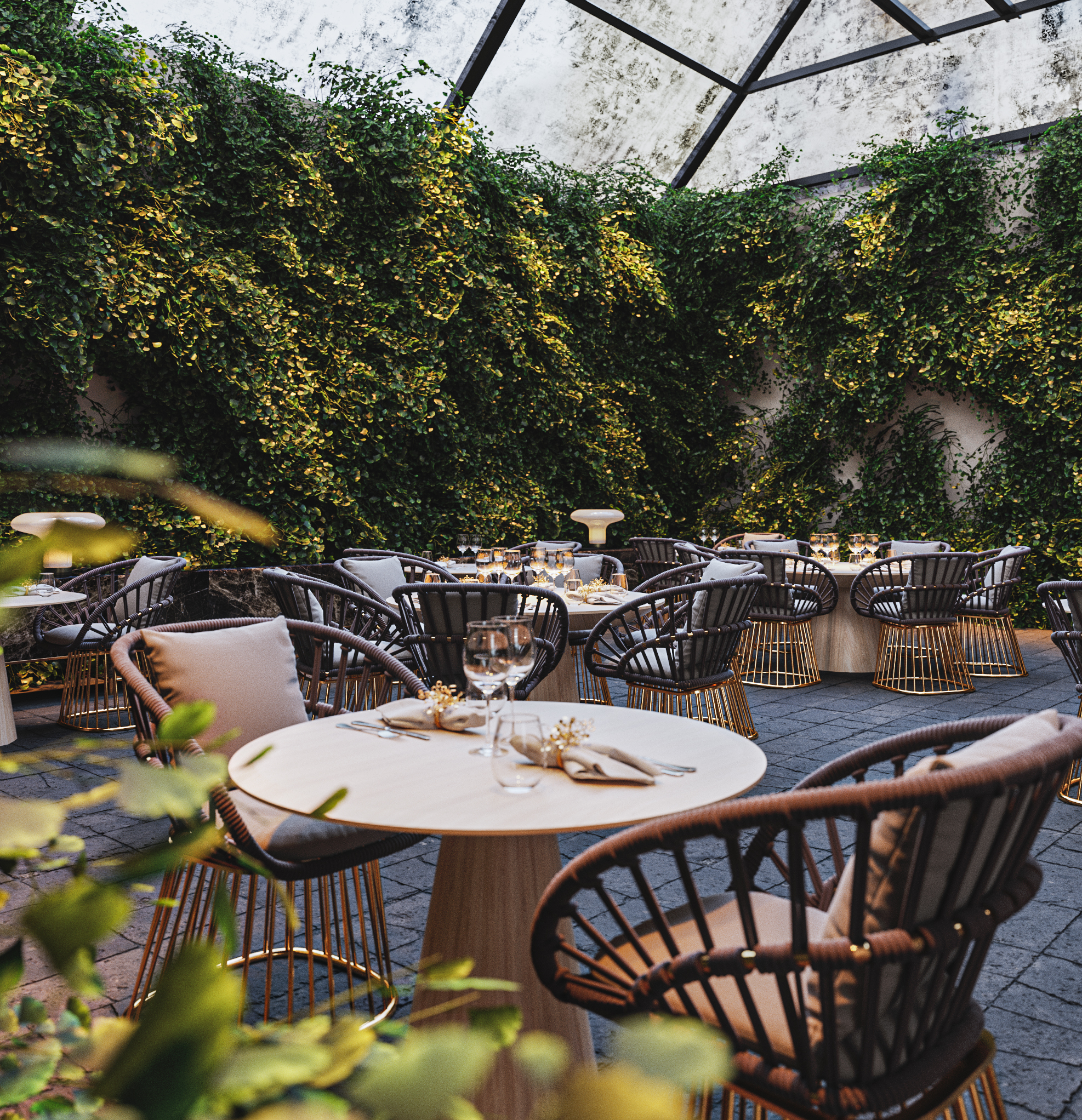 Además, el restaurante cuenta con una zona ajardinada cubierta que transmite una sensación de elegancia y comodidad, haciendo de este espacio un lugar muy acogedor.